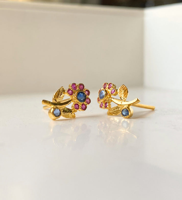 Floral Stud Earrings – 925 Sterling Silver with Natural Ruby & Blue Sapphire